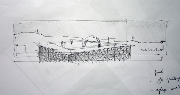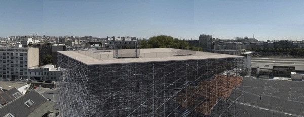 Pour lui donner corps, nous proposons d’élever une immense structure cubique de 28 m de côtés surmonté d’une fine terrasse en bois, un plan idéal entre ciel et terre. Par sa taille et la multitude de ses éléments, cet échaffaudage symbolisera la volonté des parisiens et de tous les français d’unir leurs efforts pour soutenir ce projet. Elle apparaîtra le jour comme une nuée de fines tiges de métal simulant une sorte de nuage toujours différent. Il pourra accompagner l’avancement du projet en étant support d’affichage ou d’habillage.