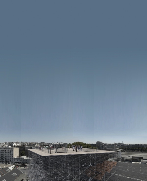 La nuit, la sous-face du belvédère s’éclairera entièrement, sa lumière se perdant dans les mailles de l’échafaudage le rendra immatériel. Cette feuille de lumière aérienne jouera le rôle d’un repère dans la nuit parisienne.